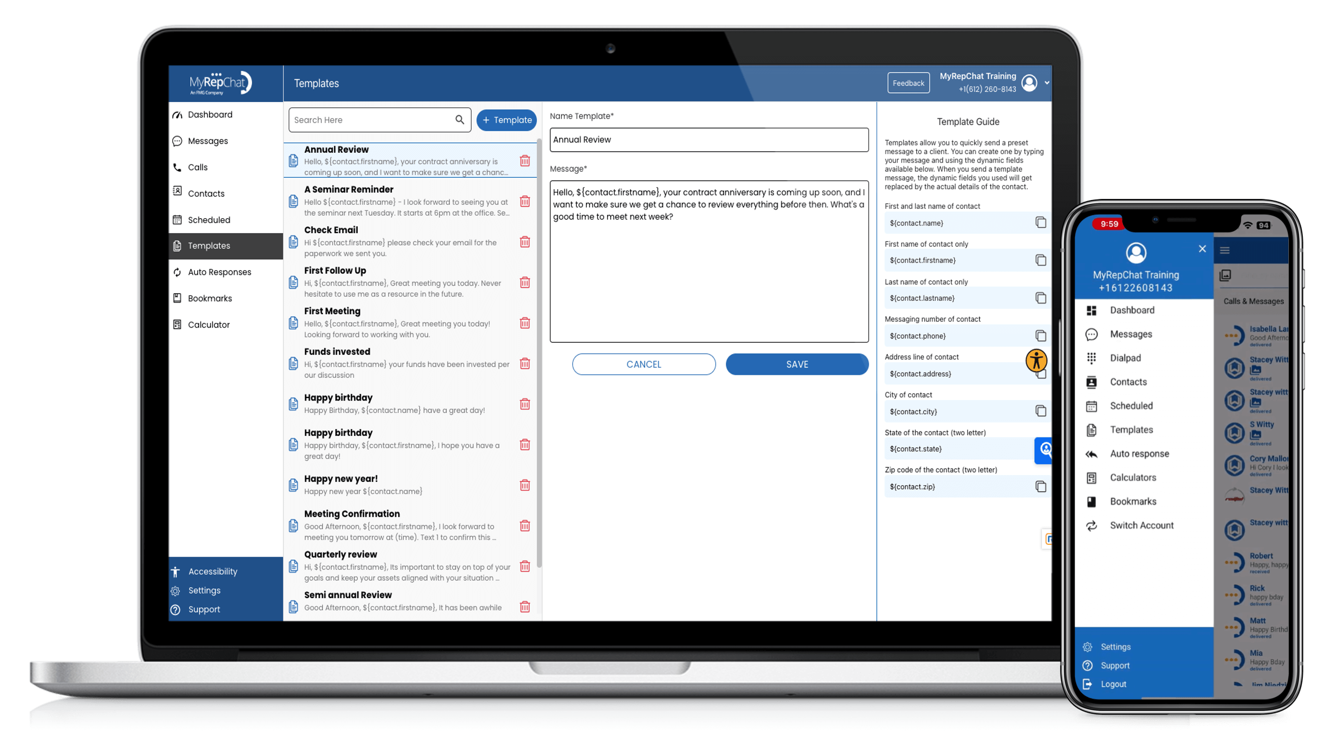 Auto Responses Enable automated replies for common scenarios like after-hours inquiries and out-of-office periods. Get a Demo 1Work at peak productivity Create keywords that will send responses automatically, even if you're busy or out of the office. 2Meeting reminders, made easy Reduce no-shows and make meetings more productive by automating appointment reminders. 3A keyword for every scenario Create keywords for all common business inquiries and use cases - from meeting reminders, to quotes and links. Reduce no shows Did you know? SMS reminders can reduce no-shows by up to 90%. MyRepChat’s auto-responses make sending reminders simple and effective. Mobile or Desktop Use and set-up auto responses on the go from your mobile device, or your desktop computer. Automate your responses today! Get Started
